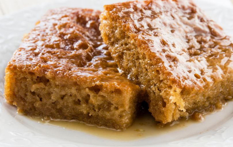 Importé des Pays-Bas, ce dessert est un gâteau sucré à base de farine, de bicarbonate de soude, de lait, de beurre, d’œufs et de confiture d’abricots, recouvert d’une sauce à la crème chaude composée de crème, de beurre, de sucre et de vanille.